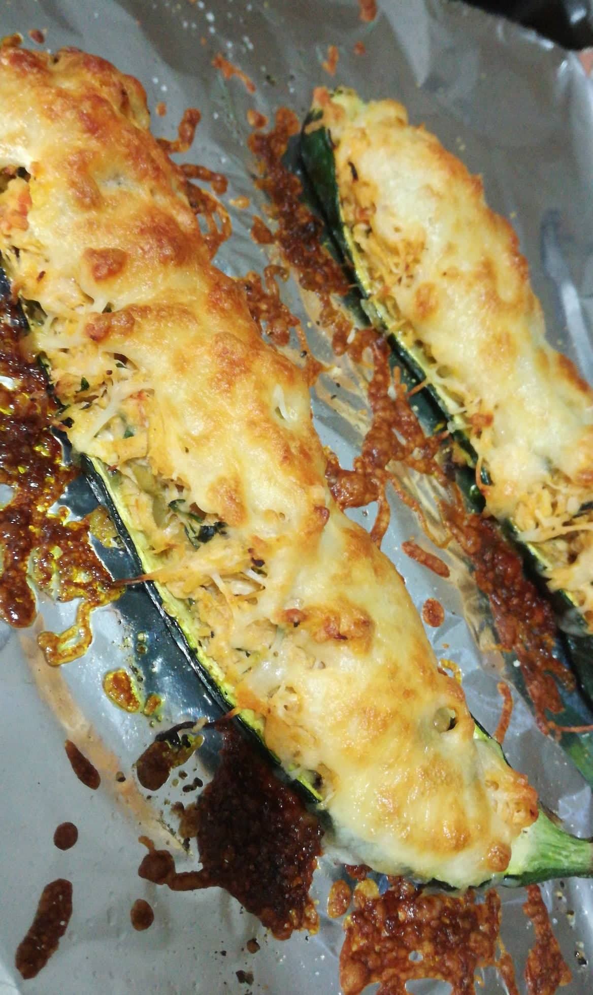 - Distribua o recheio nas metades das abobrinhas, cubra com papel-alumínio e volte ao forno por mais 10 minutos.
