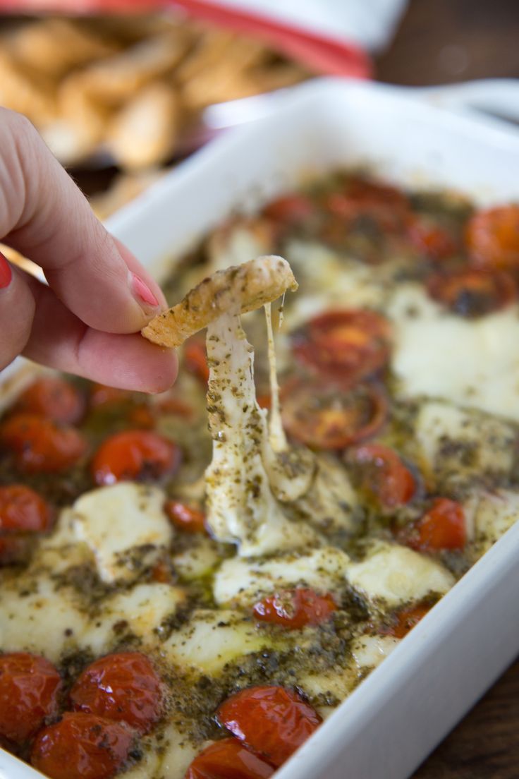 Esta versão da receita Dip caprese são com tipos diferentes de queijo e com um molho pesto.