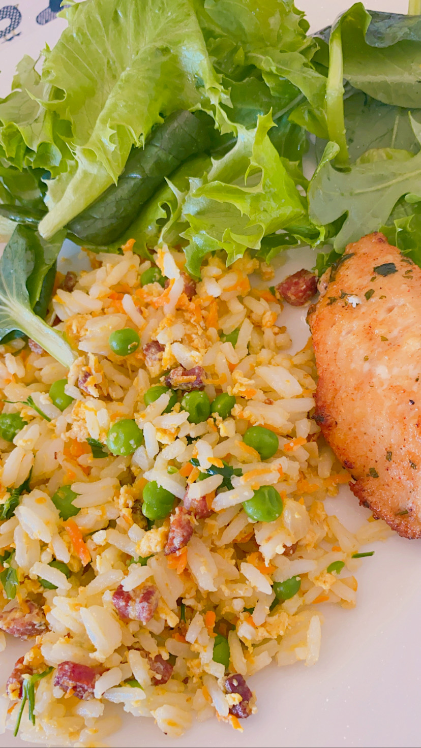 Arroz com cenoura, ervilha, ovo e bacon