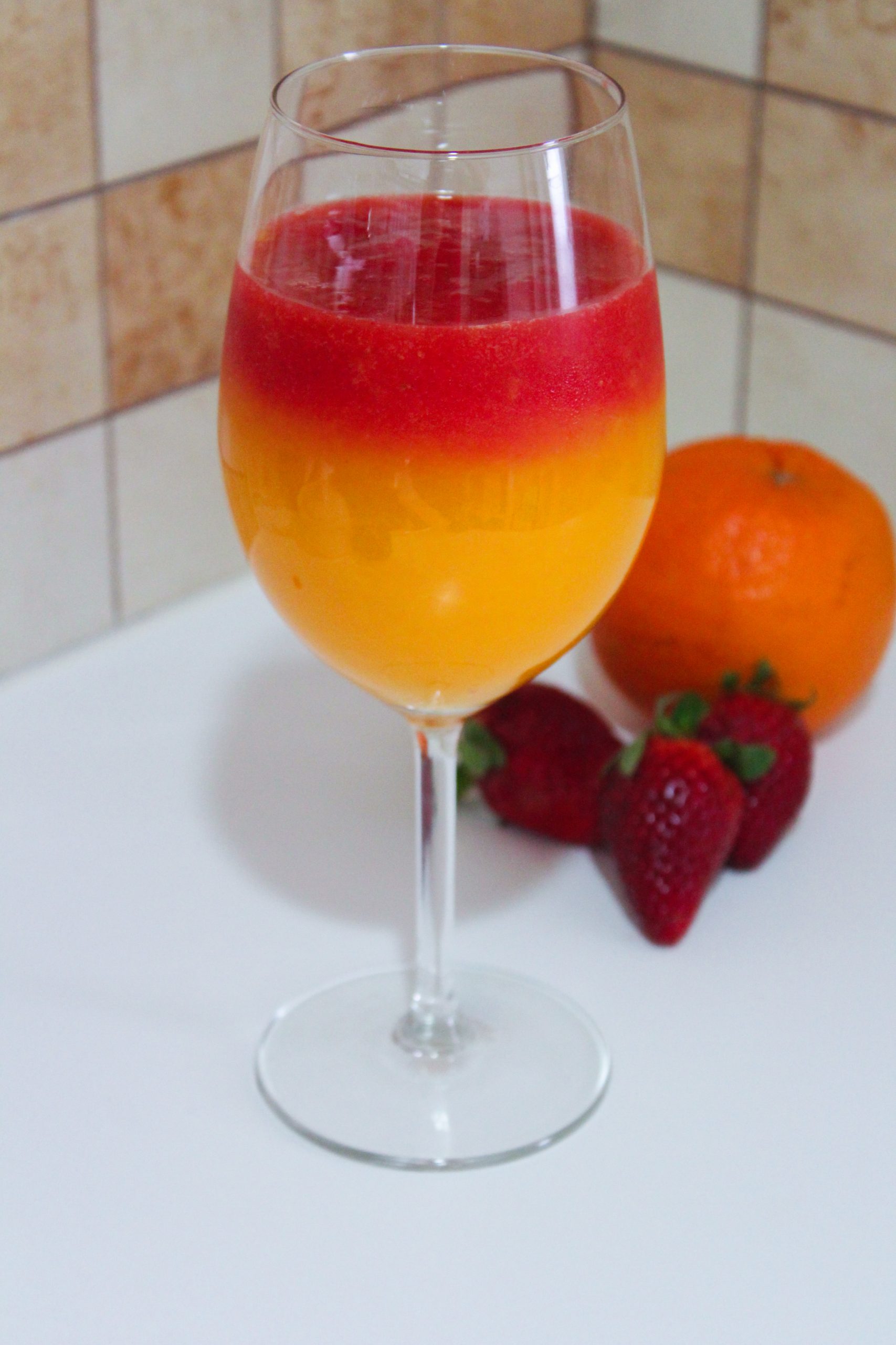 - Coloque o suco de morango sobre o suco de laranja, como o suco de morango está “congelado” ele não se mistura com o suco de laranja.