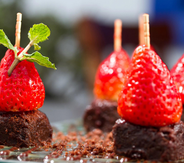 - Disponha os brownies cortados em um prato, espete o morango no palito e coloque em cima dos quadradinhos.