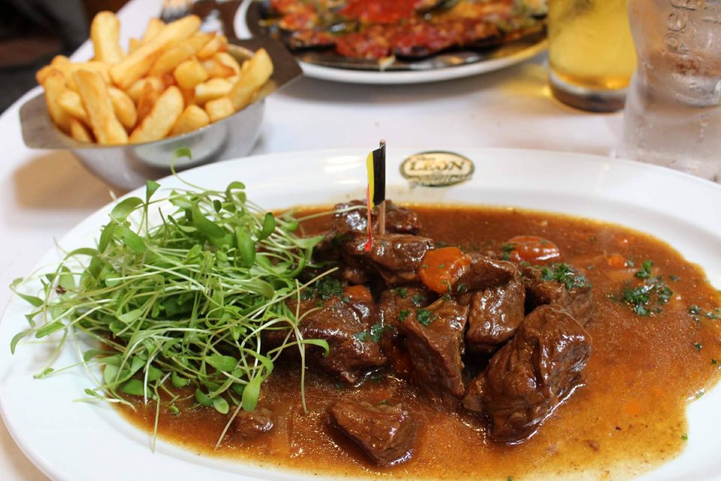 Eu pedi outro prato tradicional belga, o Carbonnades flamandes (€15,85), carne cozida na cerveja acompanhada de batata frita, a carne estava muito macia e saborosa.